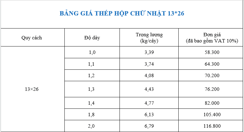 Bảng giá thép hộp 13×26 Bảng giá thép hộp chữ nhật quy cách 13×26. Thép[Xem chi tiết]